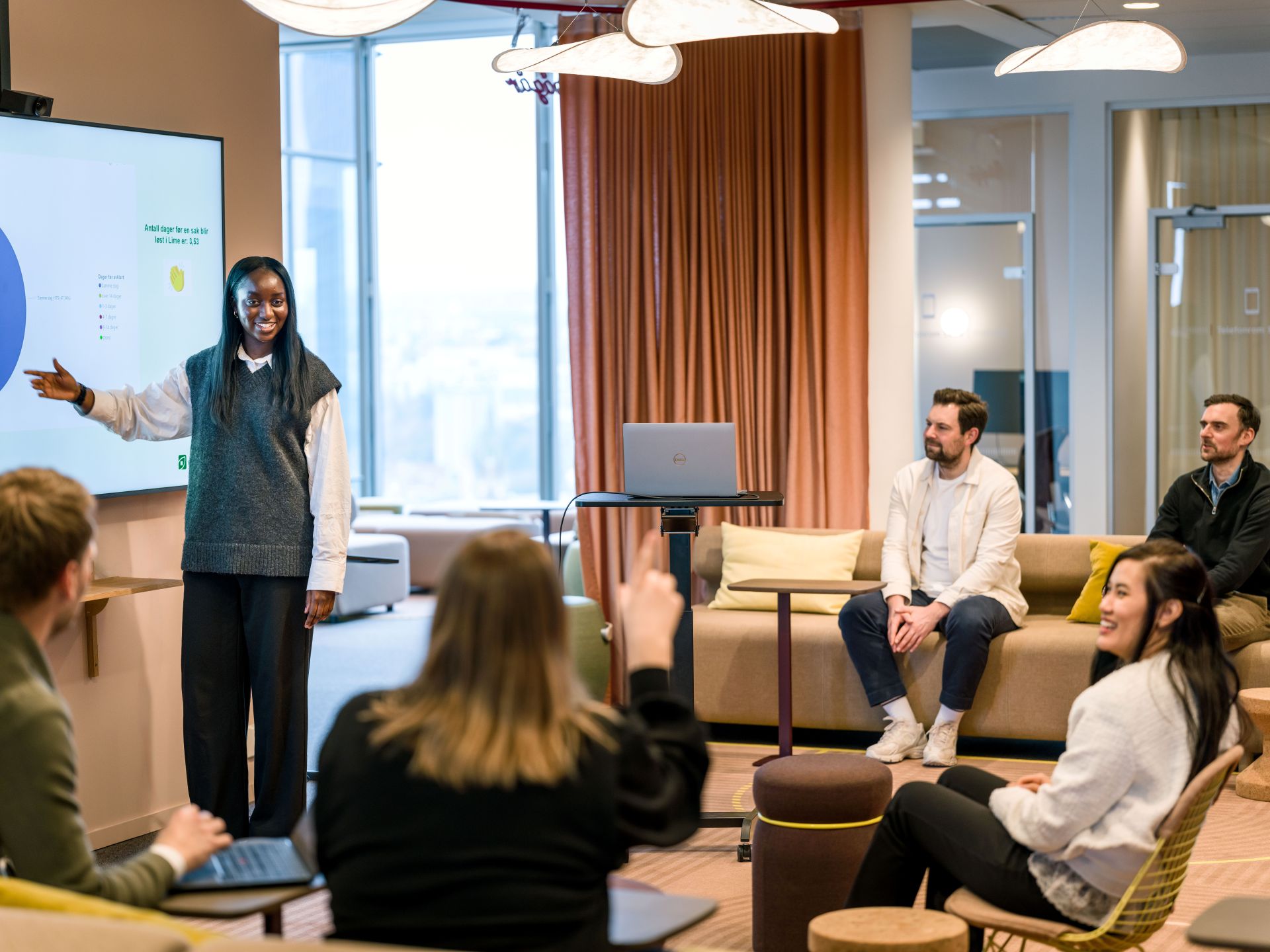 Nå oversetter vi innsikt til konkrete kontorløsninger. Sammen med interiørarkitekt og fagmiljøer i Entra, velger vi hvilke rom og funksjoner som dere trenger. Vi jobber med planløsning, akustikk, lys, fleksibilitet og materialvalg. Vi velger løsninger som skal stå seg over tid. Teknologien skal spille på lag med arbeidshverdagen: booking som gir flyt, møterom som fungerer, og sensorer der de gir nyttig innsikt.