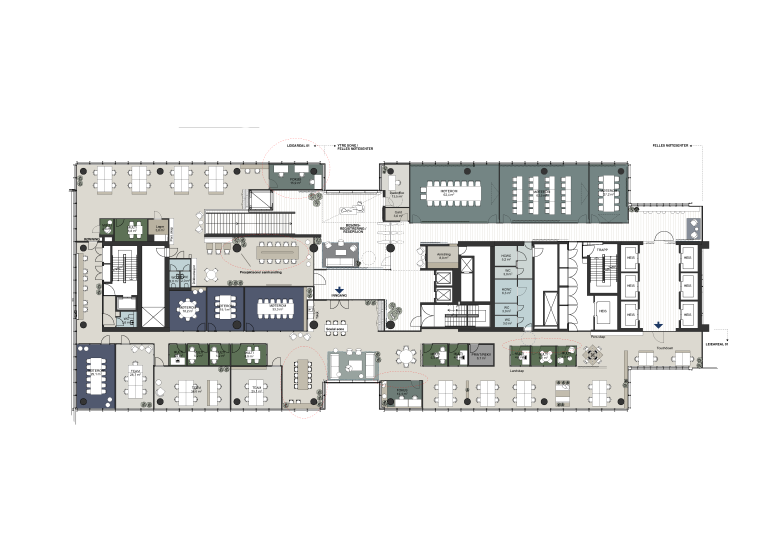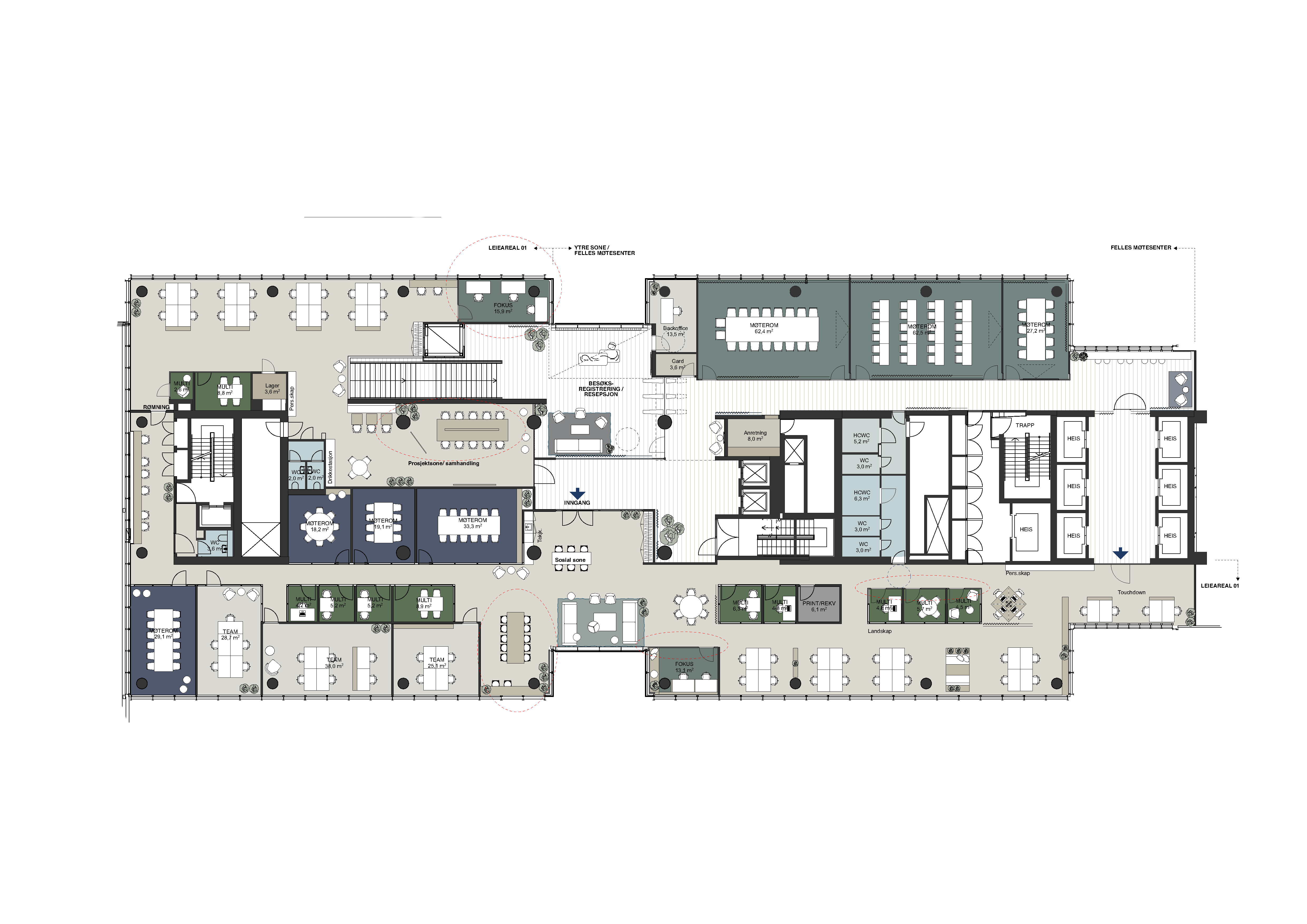 Landskap: 26 plasser Teamrom (2): 10 plasser Touchdown: 8 plasser Samhandling: 16 plasser Fokus: 3 plasser Sosial sone: 1 Møterom: 3 Multirom: 6 Print/lager: 2