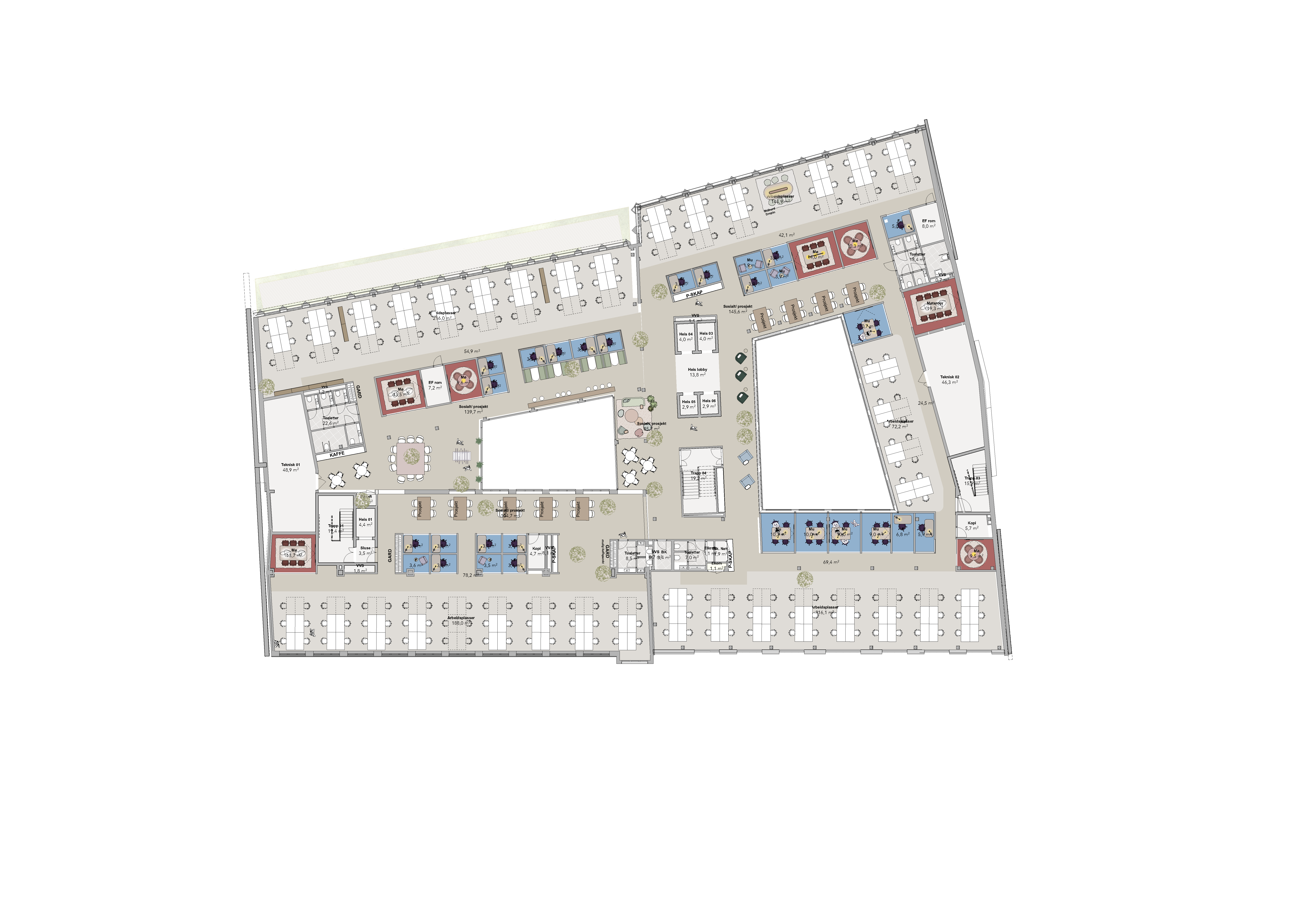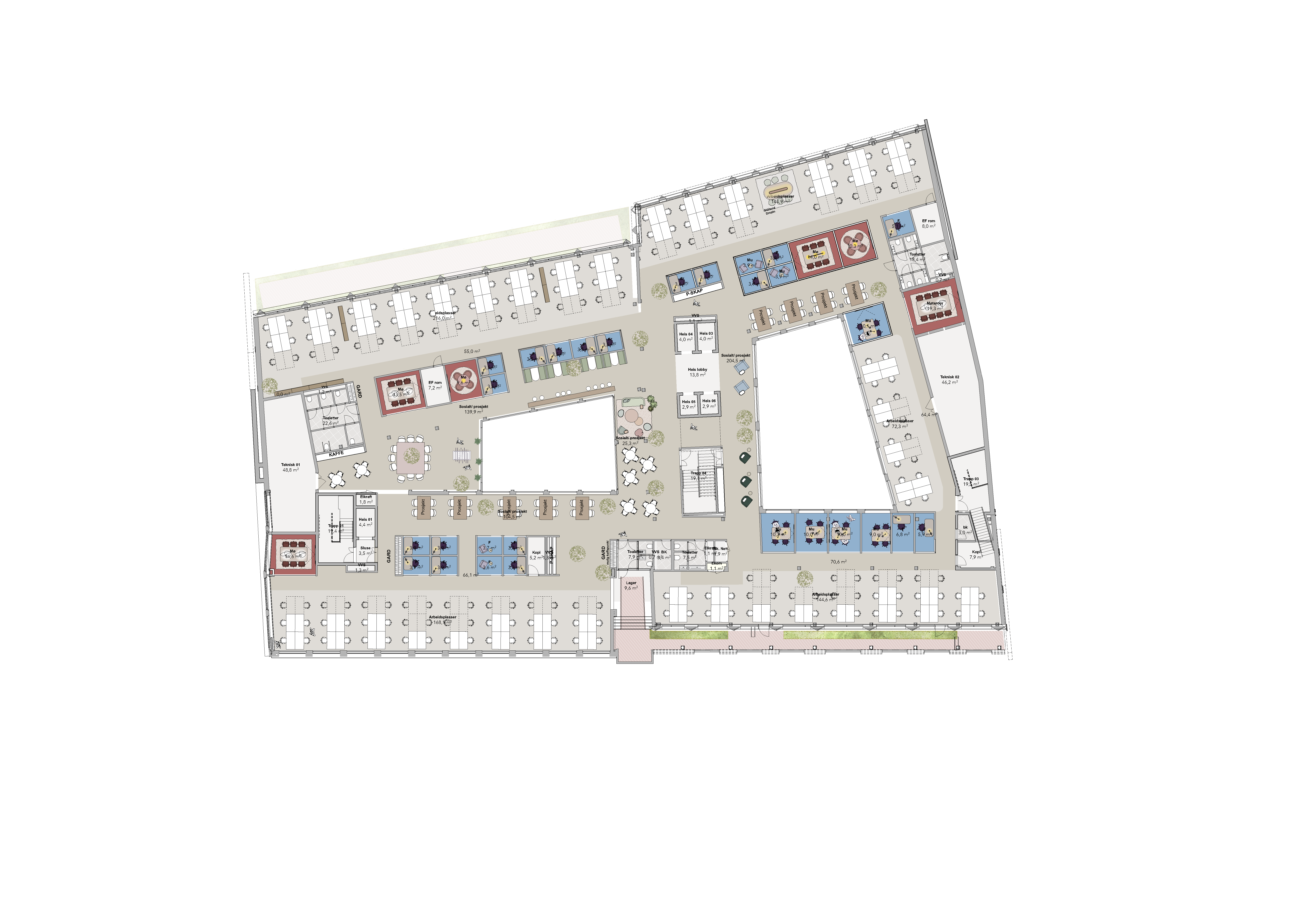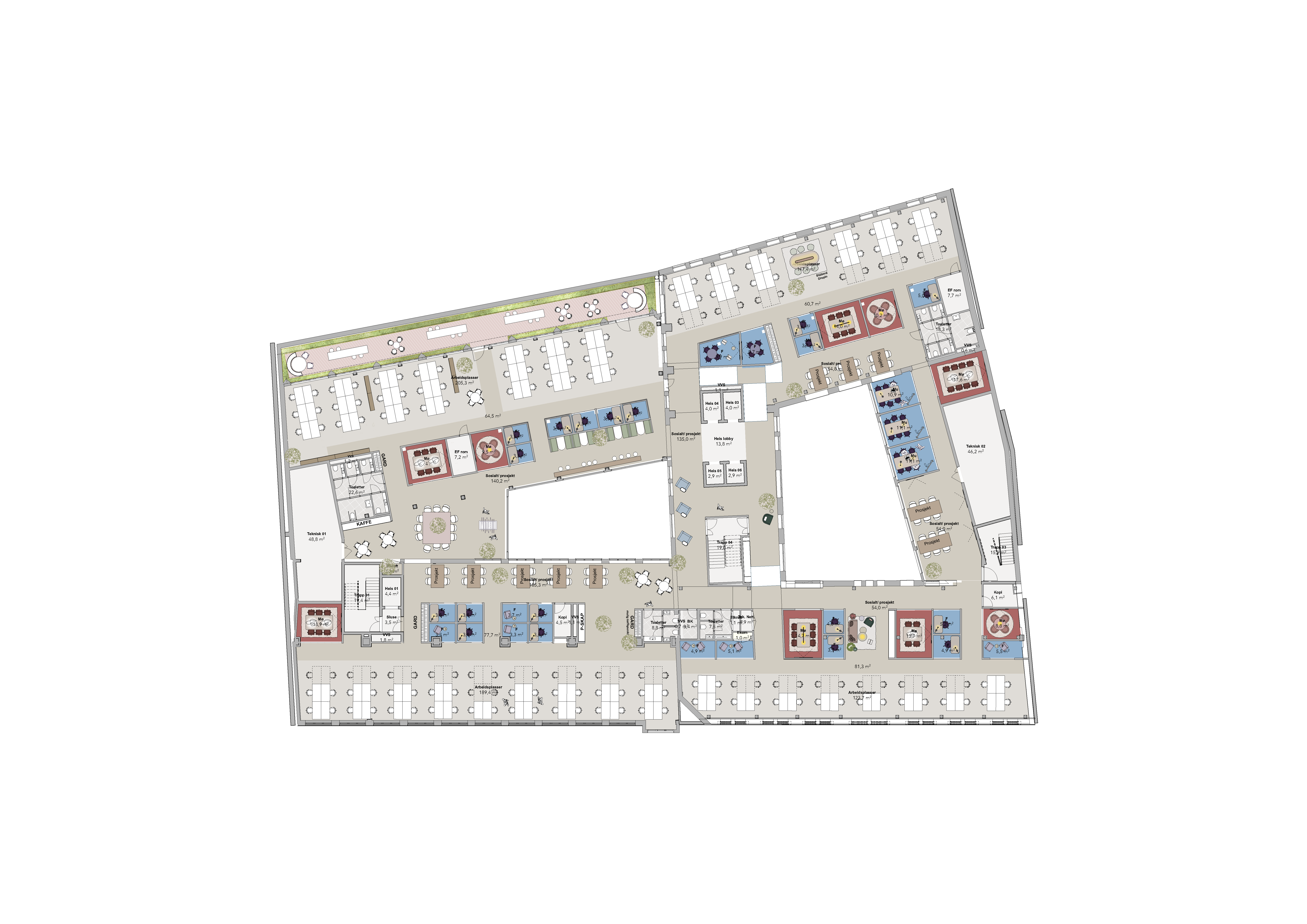 Totalt vil eiendommen bli 9. etasjer, hvor nederste etasje (kjeller) får et fantastisk treningssenter, mens toppen (taket) får en helt spektakulær takterrasse. Mellom disse kommer det fleksible og arealeffektive arbeidsplasser som oppfyller alle krav til fremtidens arbeidsplass.