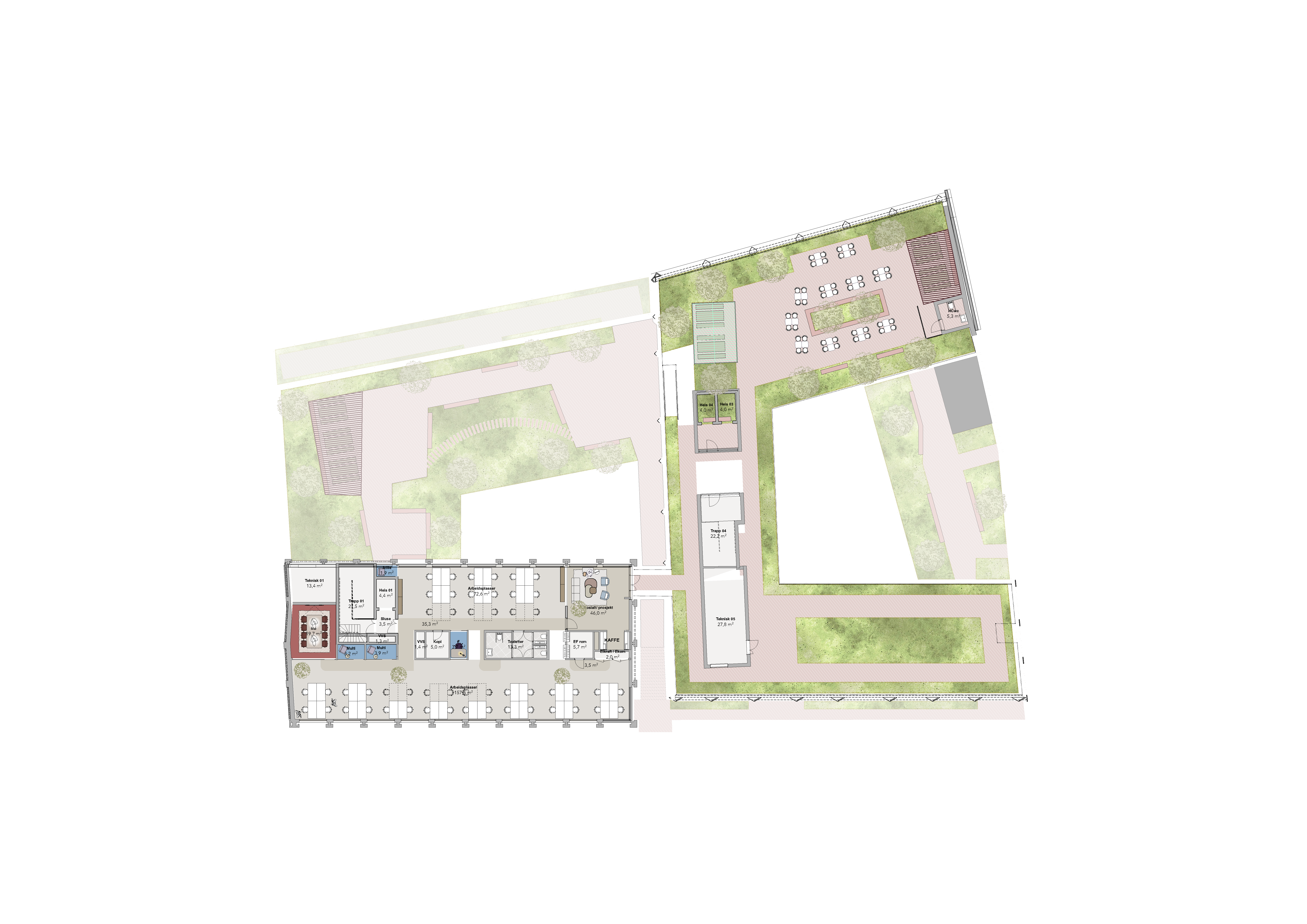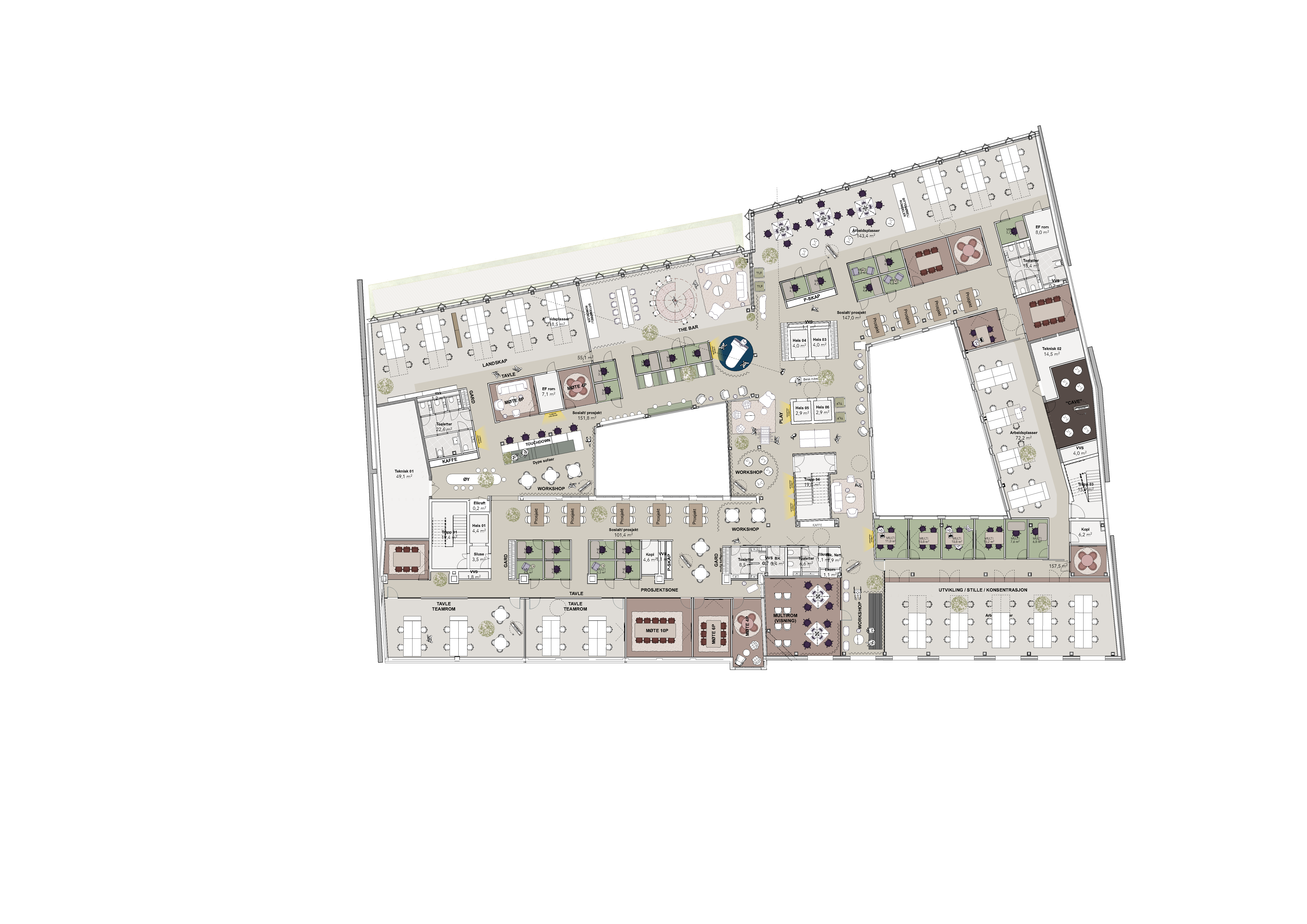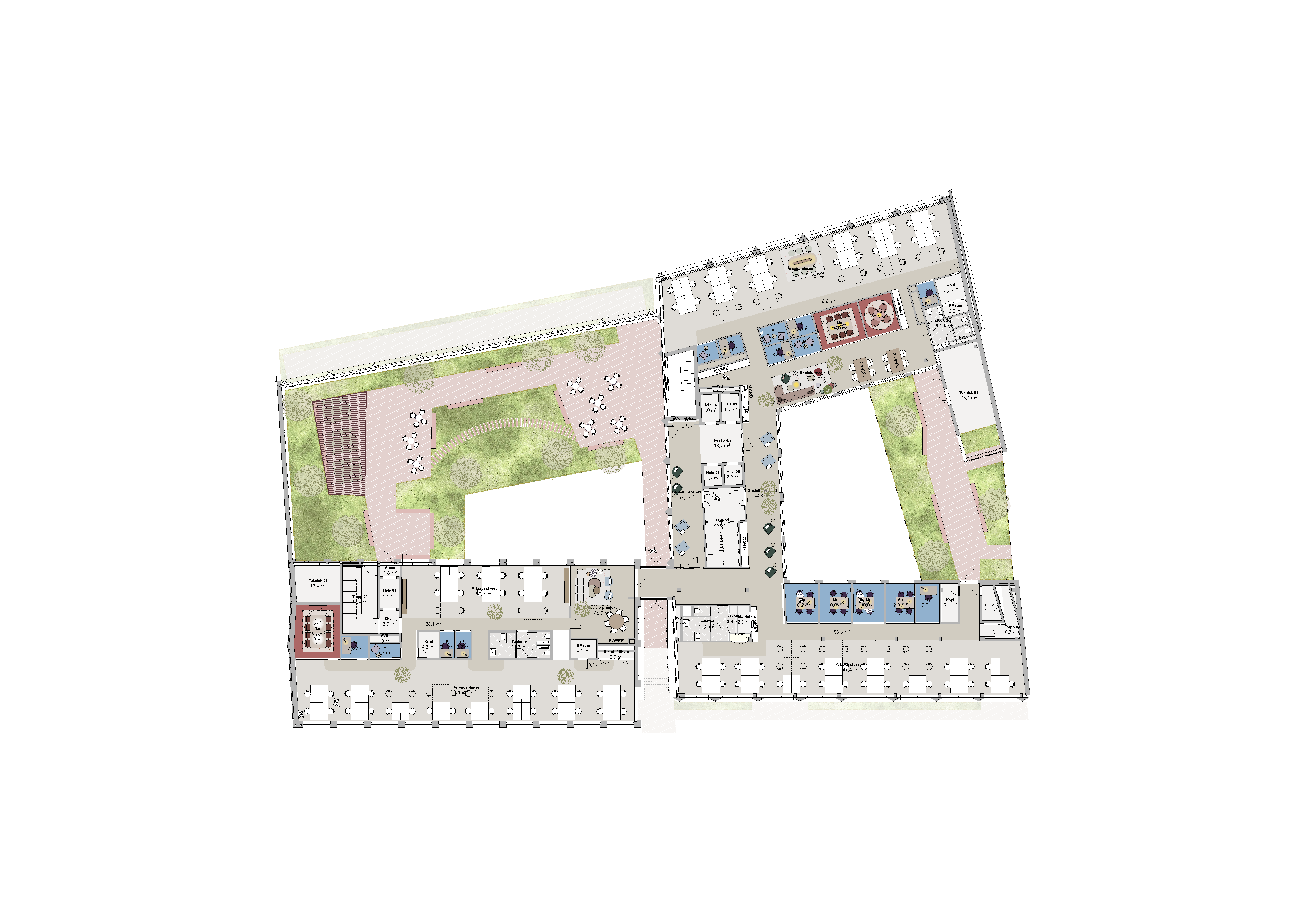 Totalt vil eiendommen bli 9. etasjer, hvor nederste etasje (kjeller) får et fantastisk treningssenter, mens toppen (taket) får en helt spektakulær takterrasse. Mellom disse kommer det fleksible og arealeffektive arbeidsplasser som oppfyller alle krav til fremtidens arbeidsplass.