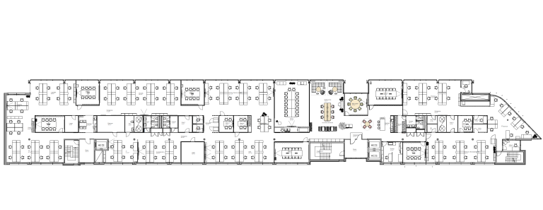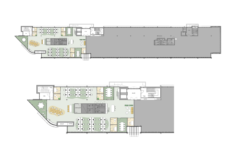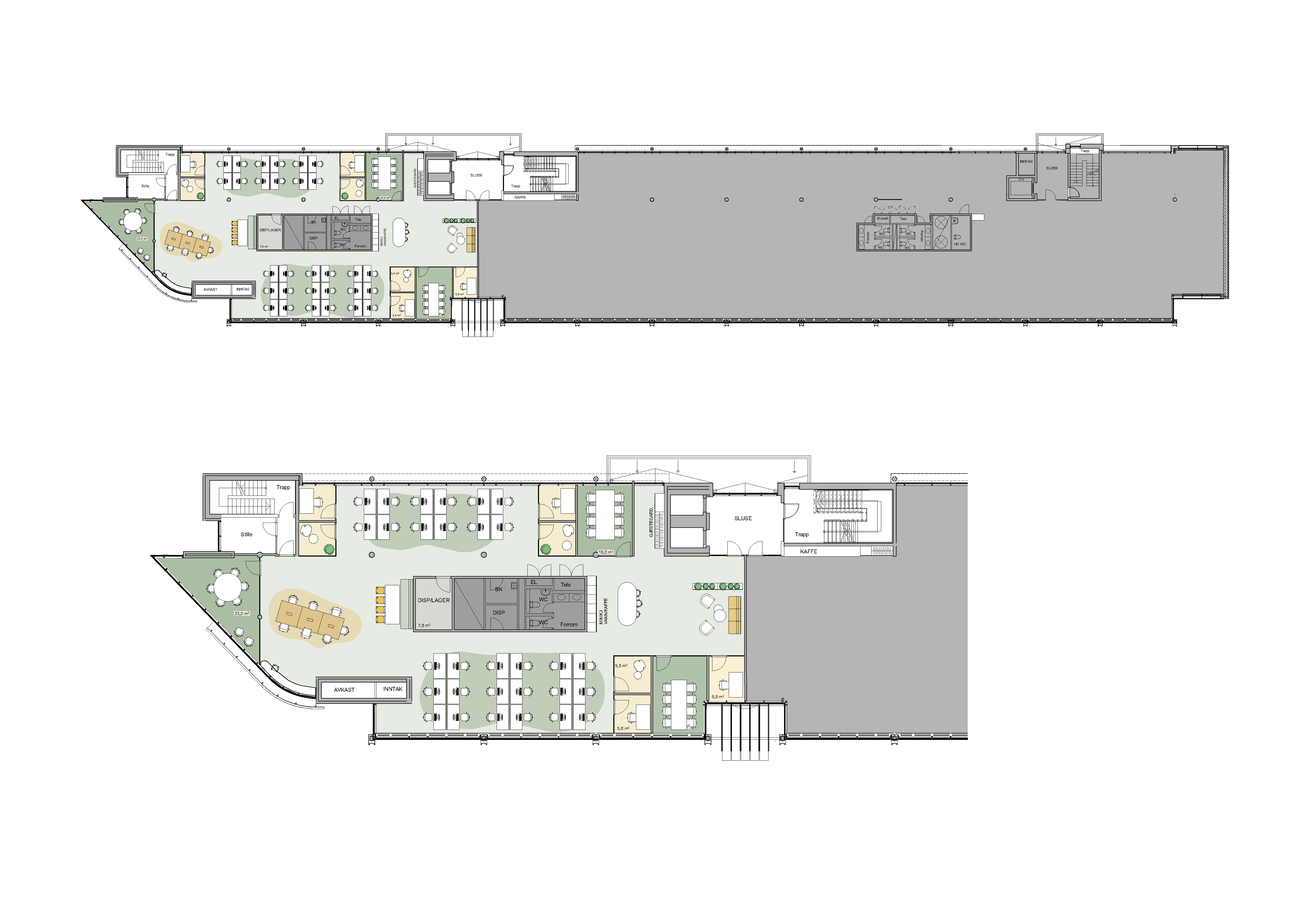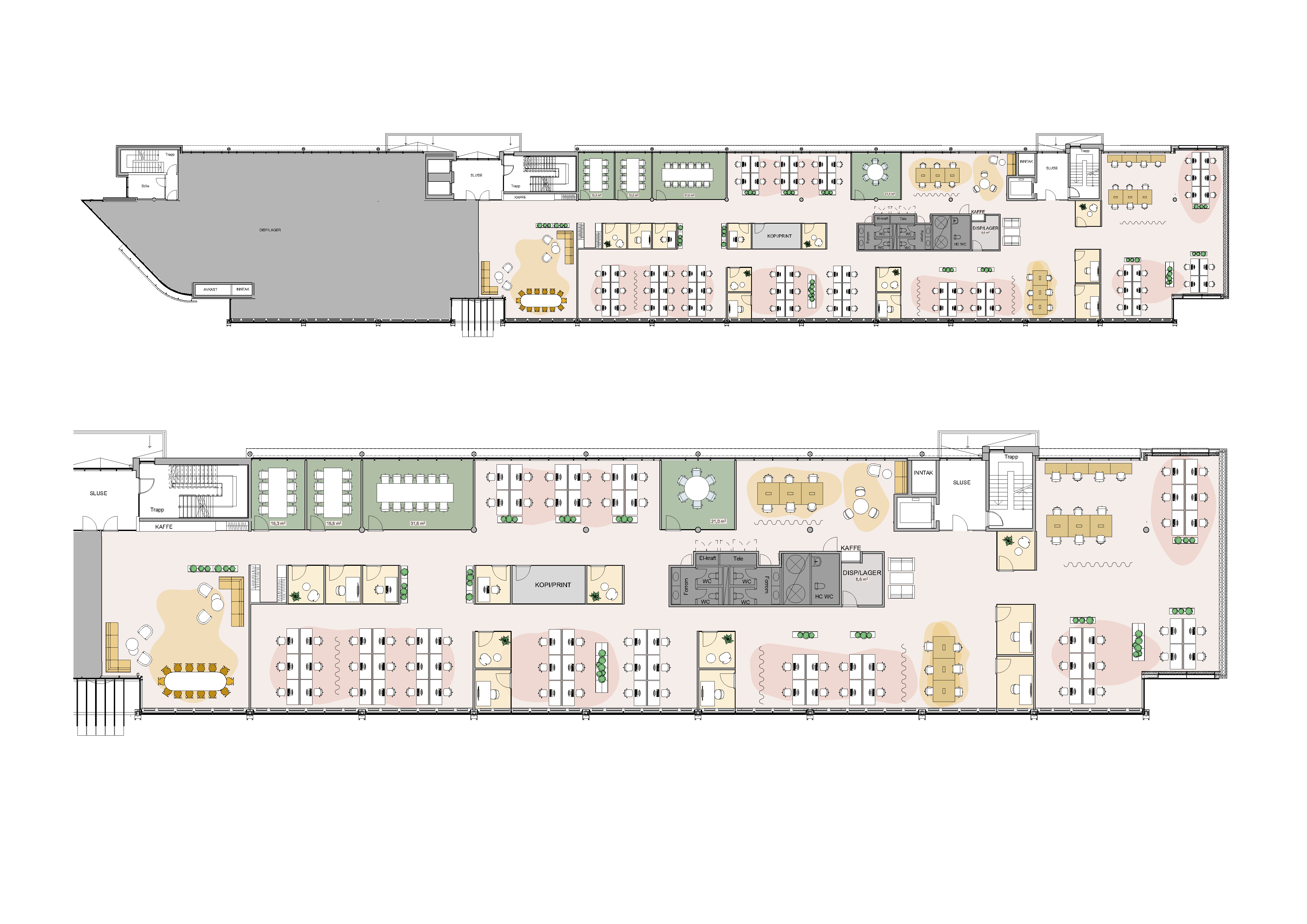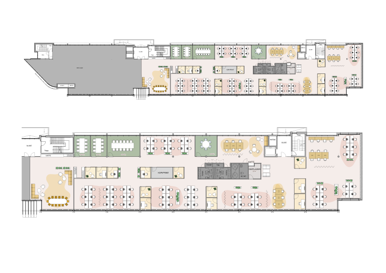 Forslag til møbleringsplan viser: 100 faste arbeidsplasser 13 multirom 11 møterom sosiale soner og støtterom Lokalene pusses opp etter ny leietakers ønsker og behov.